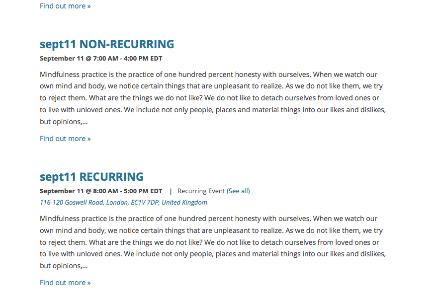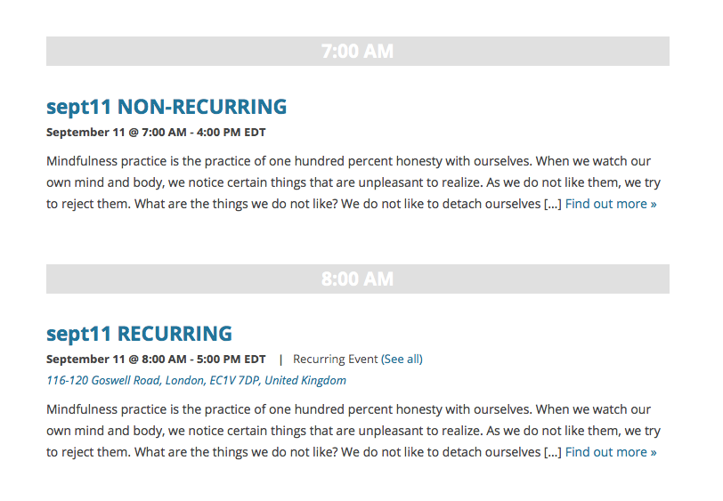If not, then I’m curious: can you create two test events exactly like I did? Create one that is non-recurring, and whose “event title” says so (e.g. “Test Event Non-Recur”) and make it happen on a given day and time. Then, create a recurring event titled something like “Test Event RECURRING” and set it up so that it has one of its recurrence instances happening just one or two hours after the non-recurring event.