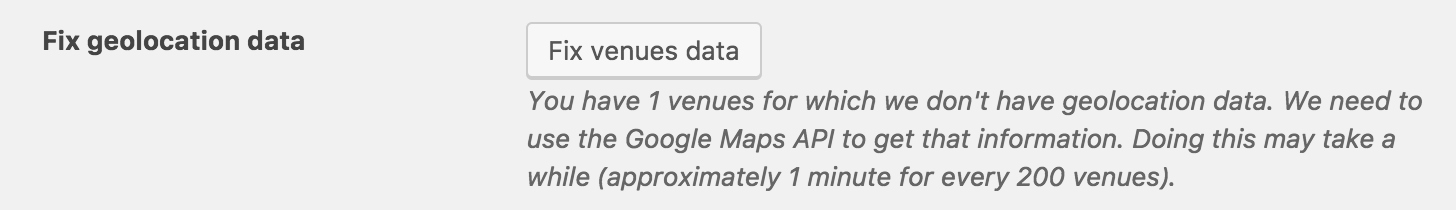 Please visit Events > Settings > General > Map Settings > ‘Fix geolocation data‘ and select the ‘Fix venues data‘ button. (see screenshot below)