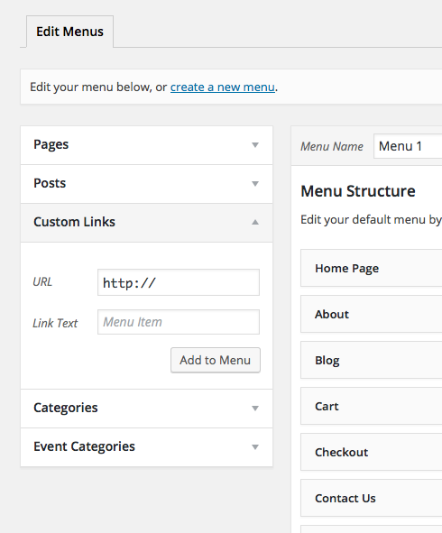 To add the link to /events to your menu, just use the “Custom Links” section in your menu-builder: