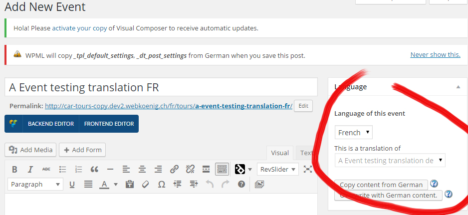 But I’m talking about situation when client want to create the translation NOT USING button ‘Overwrite with German content.’ As I described at the begining. I checked it also on clean installation here http://car-tours-clean-copy.dev2.webkoenig.ch and it works the same.
