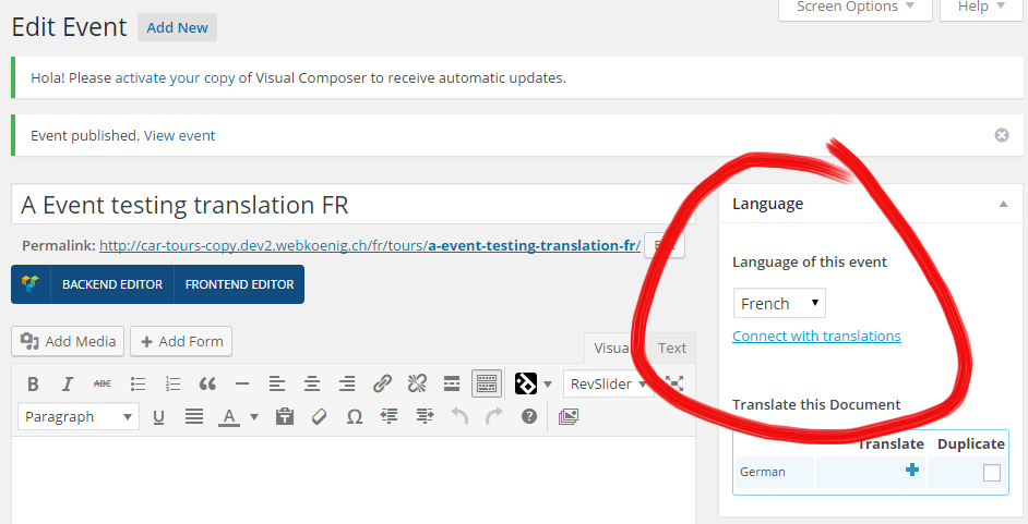 In adding form of this translation I correctly see that this new translation is connected with correct event in default language BUT after specifying a title and PUBLISHING/SAVING it this translation’s connection to oryginal event is lost and I see only link ‘Connect with translation’.Client want this to work that way because she sais that this way it’s easier for her, especialy that it was working before. And another issue is that after SECOND saving the event in permalilnk appears an attribute which was not there before ‘?lang=de’, client also wants to know where it came from, because there was not such behaviour before.