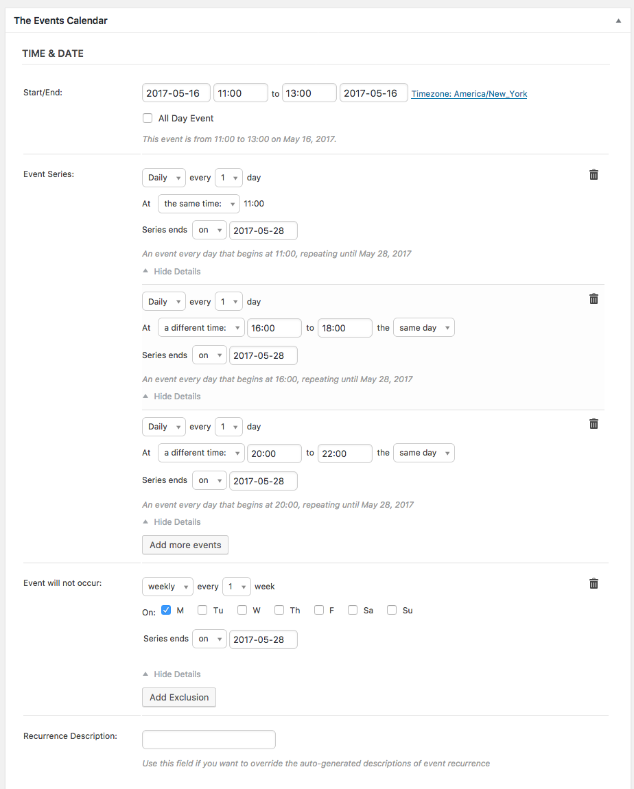 So your best bet would probably be to make three separate recurrence series. Each one should start on May 16 and end on May 28, and should have an “Exclusion” set up for every Monday so that Mondays don’t have events. Make the first series be for the 11โ13 event, then another one for the 16โ18 event, and then another for the 20โ22 event.