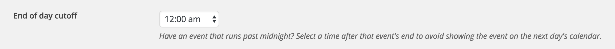Can you send over a screenshot of the ‘Time & Date’ settings for one of the events showing on the calendar after it’s ended? Also, what do you have for your ‘End of day cutoff’ setting found under Events > Settings > General? (see screenshot below)