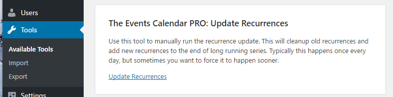 $recurrence_scheduler = Tribe__Events__Pro__Recurrence__Meta::$scheduler; if ( is_a( $recurrence_scheduler, 'Tribe__Events__Pro__Recurrence__Scheduler' ) ) { $recurrence_scheduler->add_hooks(); do_action( Tribe__Events__Pro__Recurrence__Scheduler::CRON_HOOK ); }I wrote a small extension/tool that packages the above into a lovely UI. If you download, install and activate this plugin you will find a new tool in WP Admin > Tools > Available Tools: tribe-ext-recurrence-update-0-1-0