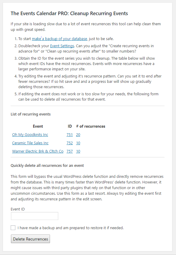 Having the same issue with one recurring event going out of control 26,000 occurences. Locking up my site where I can’t perform backups, site performance is slow, etc.