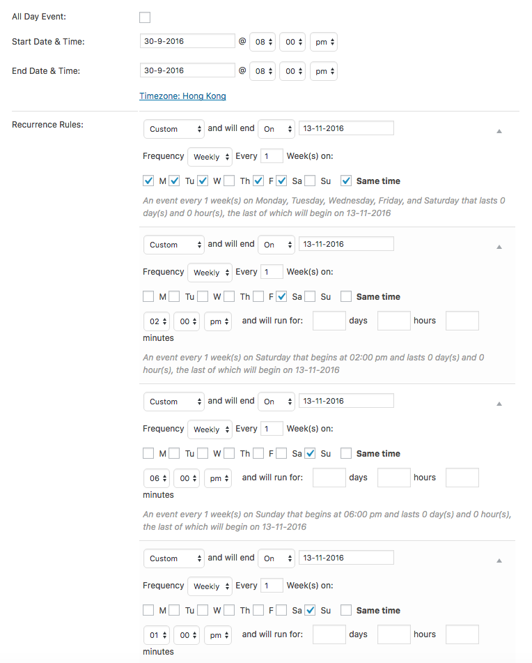 - The topic ‘second performance on same day, not displaying in month, day or ‘see all’ views’ is closed to new replies.