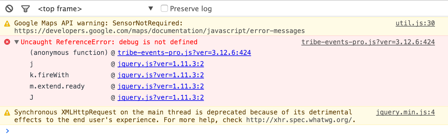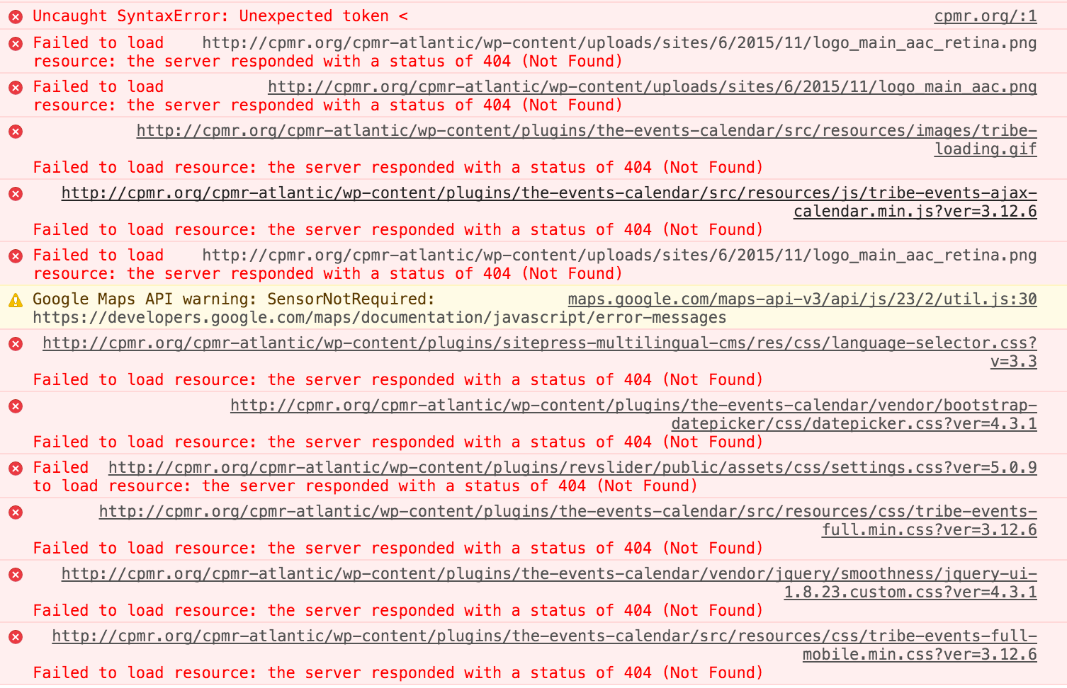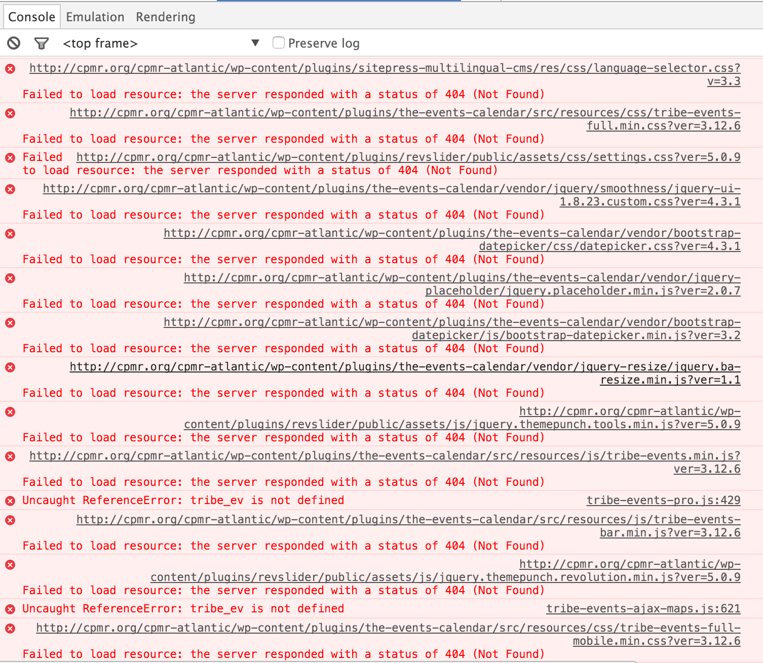 Loading http://cpmr-atlantic.org/events/list/ (with the hosts file edit you gave me before) now no longer has any Chrome console errors. I see you have some sort of The Events Calendar debugging on though.