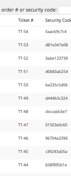 So, for example, in this screenshot are tickets for an event whose title is “Test Tickets”. So the IDs are all prefaced with TT-, and then the ticket number: