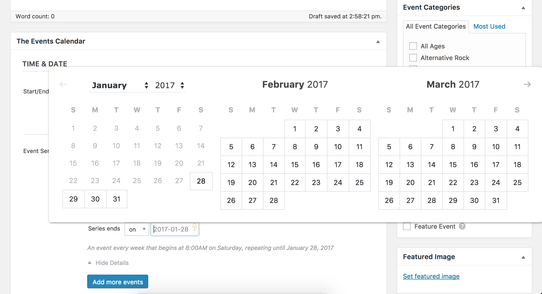 Add more eventsSo when I get here and click on “ends on” no calendar comes up to choose a date, nor is there a space I can manually add the date it would stop…
