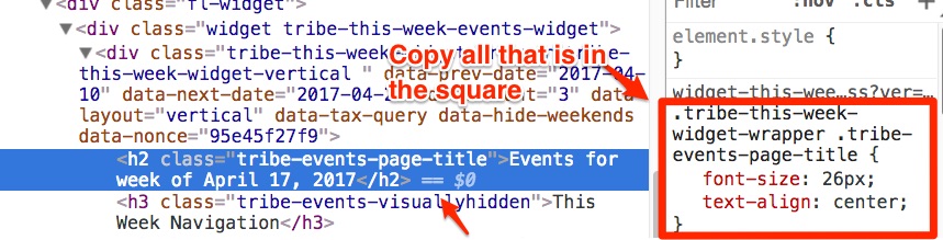 The TEC and support is wonderful….. I am using the weekly event widget (see attached pic).Q1: How can I change the widget text at the top to read: “Events for April, 10th” in a smaller font!