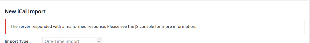 I have had trouble producing your same error, but two things have happened since your thread has started here: first, another Tribe team member has produced your error, and so our developers are now working hard on a maintenance release for both The Events Calendar and The Events Calendar: iCal Importer. Next, I’ve since been trying to reproduce the error so that I could hopefully offer some better help here, but for me, no matter what I try on my local testing site, I keep encountering this error and cannot import a file: