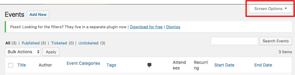 function tribe_events_manage_admin_columns( $columns ) { $list = [ 'title', 'author', 'tags', 'comments', 'date', 'tickets' ]; foreach ( $list as $item ) { if ( isset( $columns[ $item ] ) ) { unset( $columns[ $item ] ); } } return $columns; } add_filter( 'manage_tribe_events_posts_columns' , 'tribe_events_manage_admin_columns' );Is going to remove all columns from the default of the events you can update the variable list with the columns that you want to remove so it match your needs.