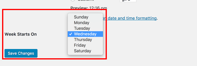 Then go to the bottom and you should be able to locate the section where you can change the default start date of the week and this will update how the calendar starts as well.
