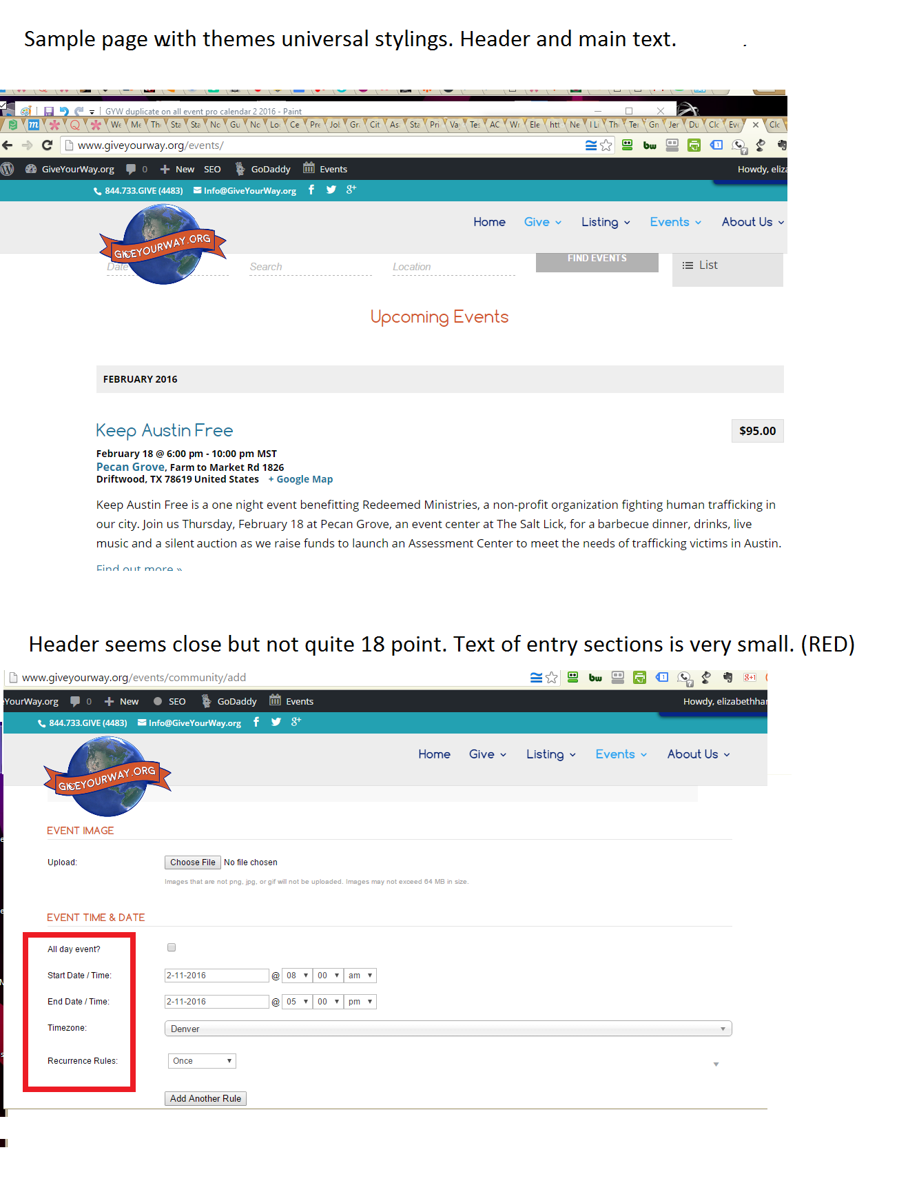 I am new-ish to coding an we use a child theme, would I update the child theme css file? I’d prefer to not alter the theme code itself by mistake but rather make the event pro calendar retain the same heading and font size features. (heading 18 pts. text @ 14 pts). Do you know what the specific code is I would add tot he child css file?December 4, 2015 at 2:14 pm in reply to: Set United States Time Zone in community events add event page #1035770Elizabeth