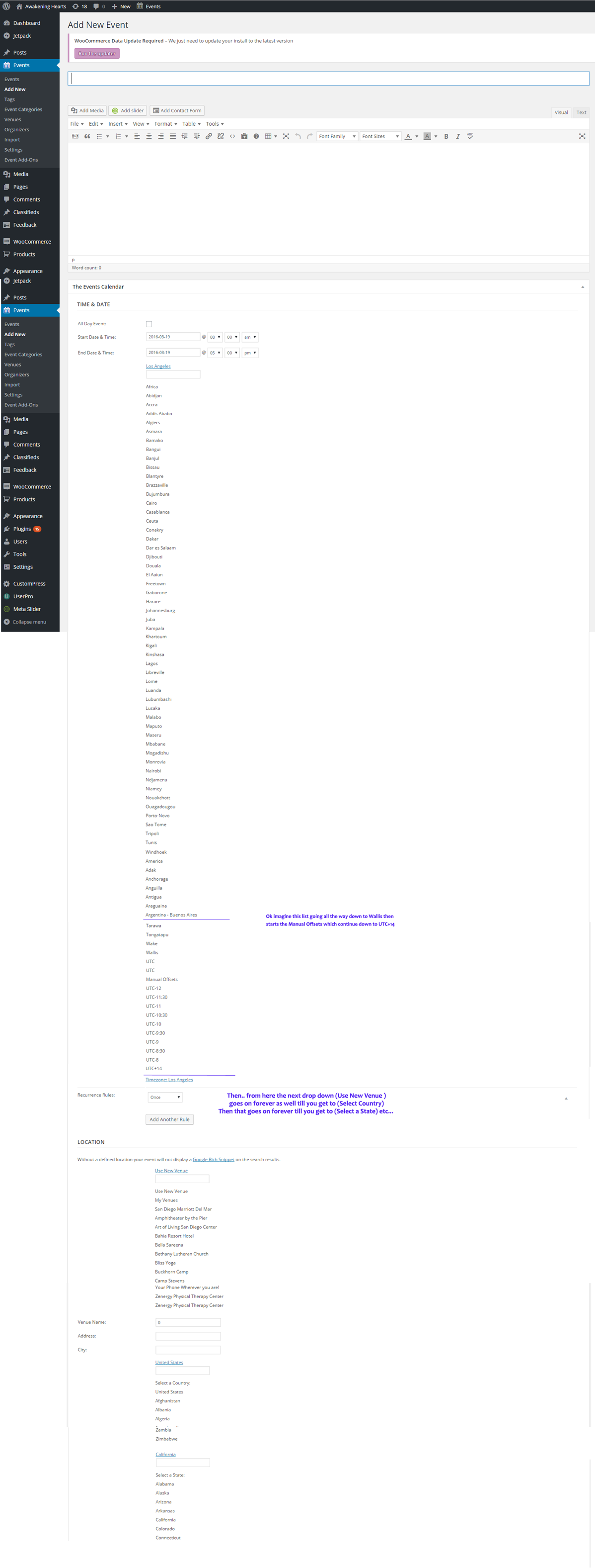 Also on that Users Add Event page the area of Categories is one long huge block shouldn’t it have a little down arrow in the upper right of that section that closes it after checking your categories? See below screen shot of what I’m talking about.